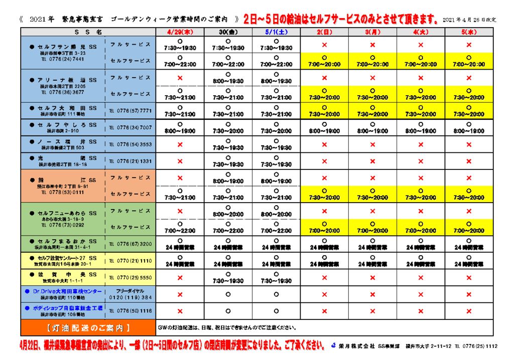 お知らせ 2021年 インフォメーション 2021.12.23 一部SSの営業時間変更のご案内です。 営業予定表ダウンロード … インフォメーション 2021.12.01 2021年末・年始の営業予定です。 営業予定表ダウンロード … インフォメーション 2021.04.26 2021年ゴールデンウィークの営業予定です。 ゴールデンウィークの営業予定表ダウンロード … 最近の記事 コミュニティガス原料費調整のお知らせ コミュニティガス原料費調整のお知らせ コミュニティガス原料費調整のお知らせ コミュニティガス原料費調整のお知らせ 給湯器省エネ2025事業のご案内 カテゴリ 当社からのお知らせ ガス・住設情報 カーライフ情報 サービスステーション カーリース 採用情報 過去の記事 2026年3月 2025年12月 2025年9月 2025年6月 2025年5月 2025年3月 2024年12月 2024年10月 2024年9月 2024年6月 2024年3月 2024年2月 2024年1月 2023年12月 2023年10月 2023年9月 2023年8月 2023年7月 2023年6月 2023年3月 2023年2月 2022年11月 2022年8月 2022年4月 2021年12月 2021年4月 2020年5月 2019年12月 2019年7月